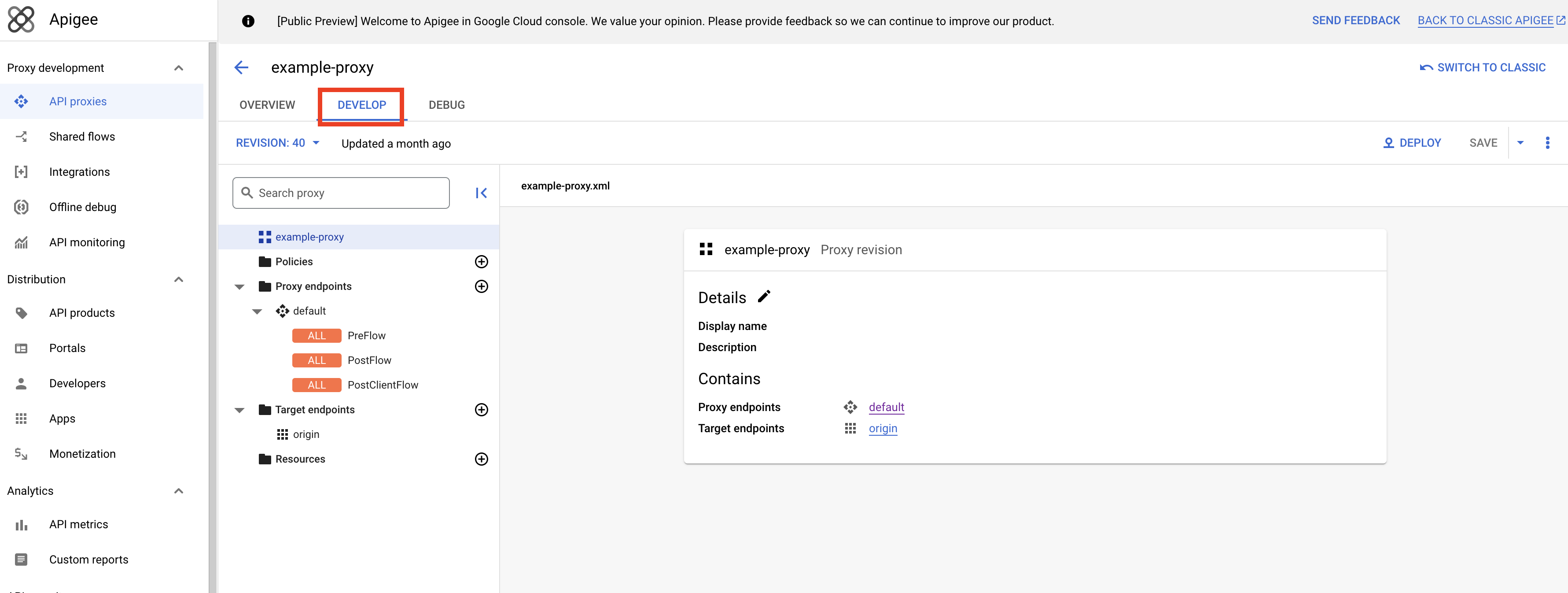 - Select the the API Proxy or Shared Flow you would like to add the HUMAN enforcer to and click on the Develop tab.