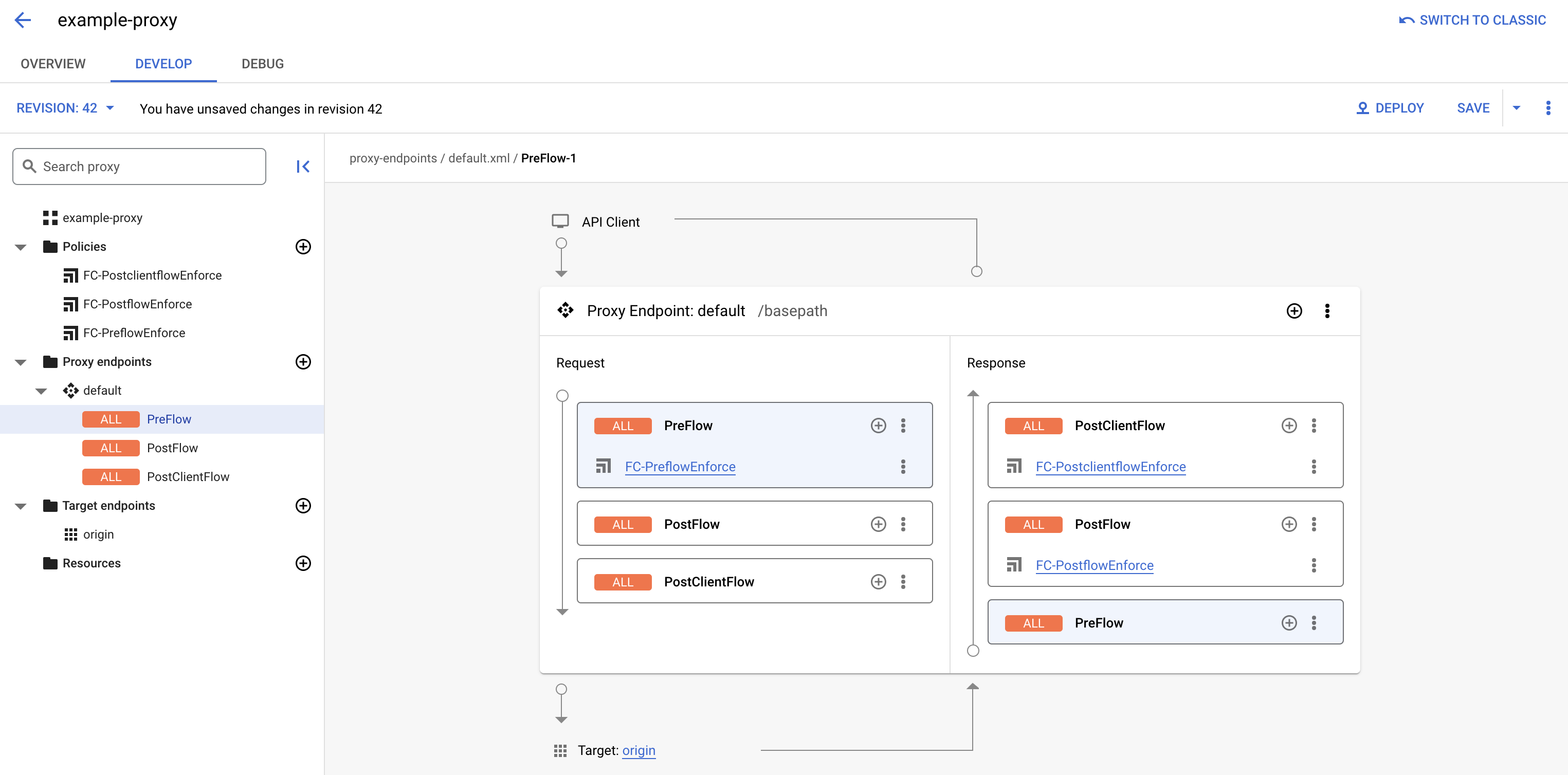 However, since there is no flow hook for the PostClientFlow, the postclientflow-enforce Shared Flow Bundle must still be triggered on all applicable API Proxies via a FlowCallout policy (FC-PostclientflowEnforce) as described above.