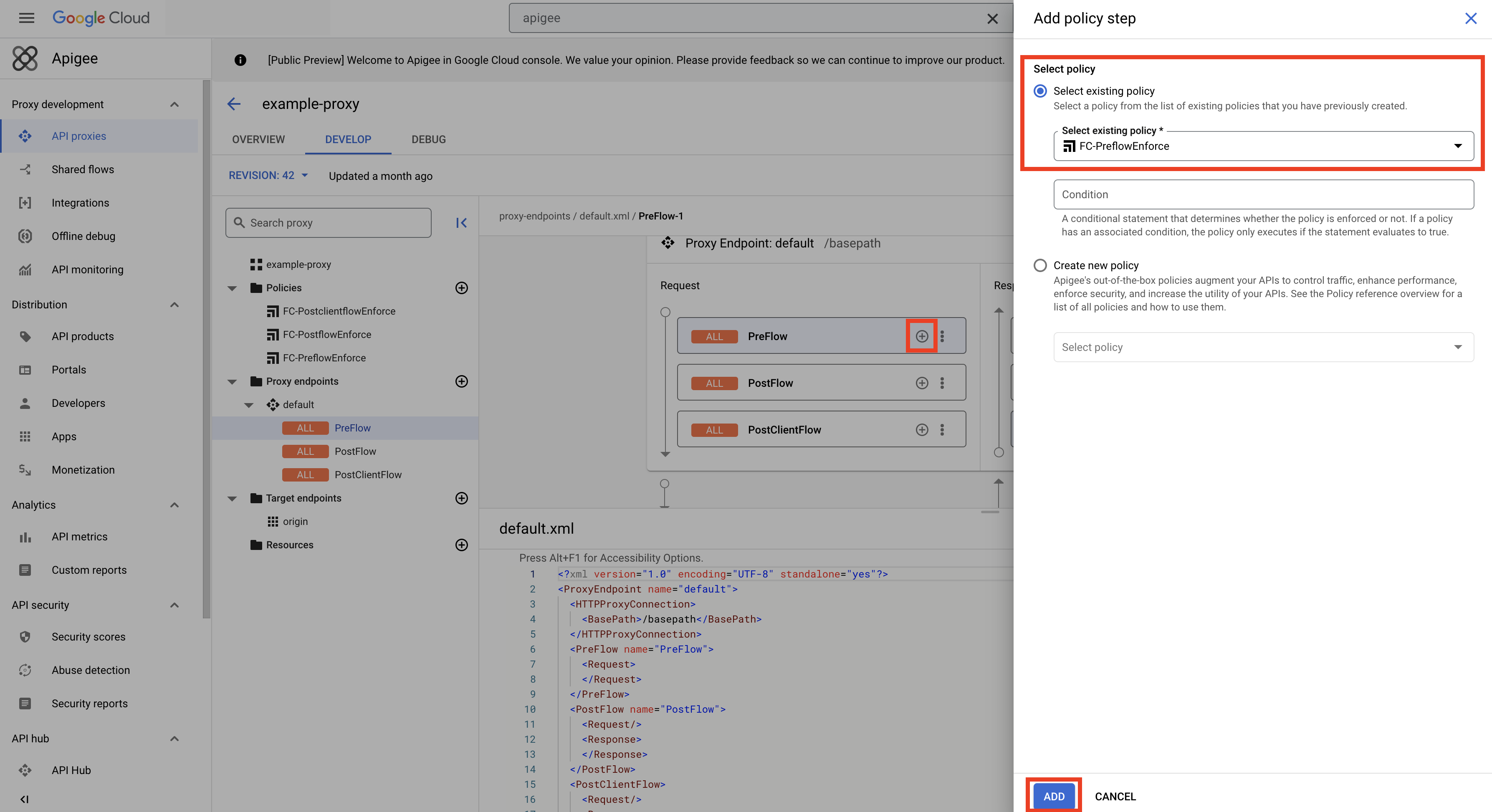 - Click on the Proxy endpoints folder. Click on the plus (+) sign next to the Request PreFlow section to add a policy step. Select the existing