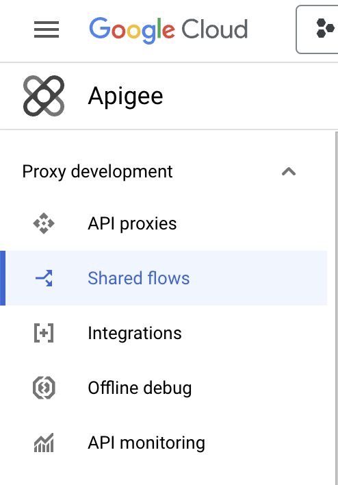 - Click on the left menu in the Apigee main page screen > Proxy development > Shared Flows.
