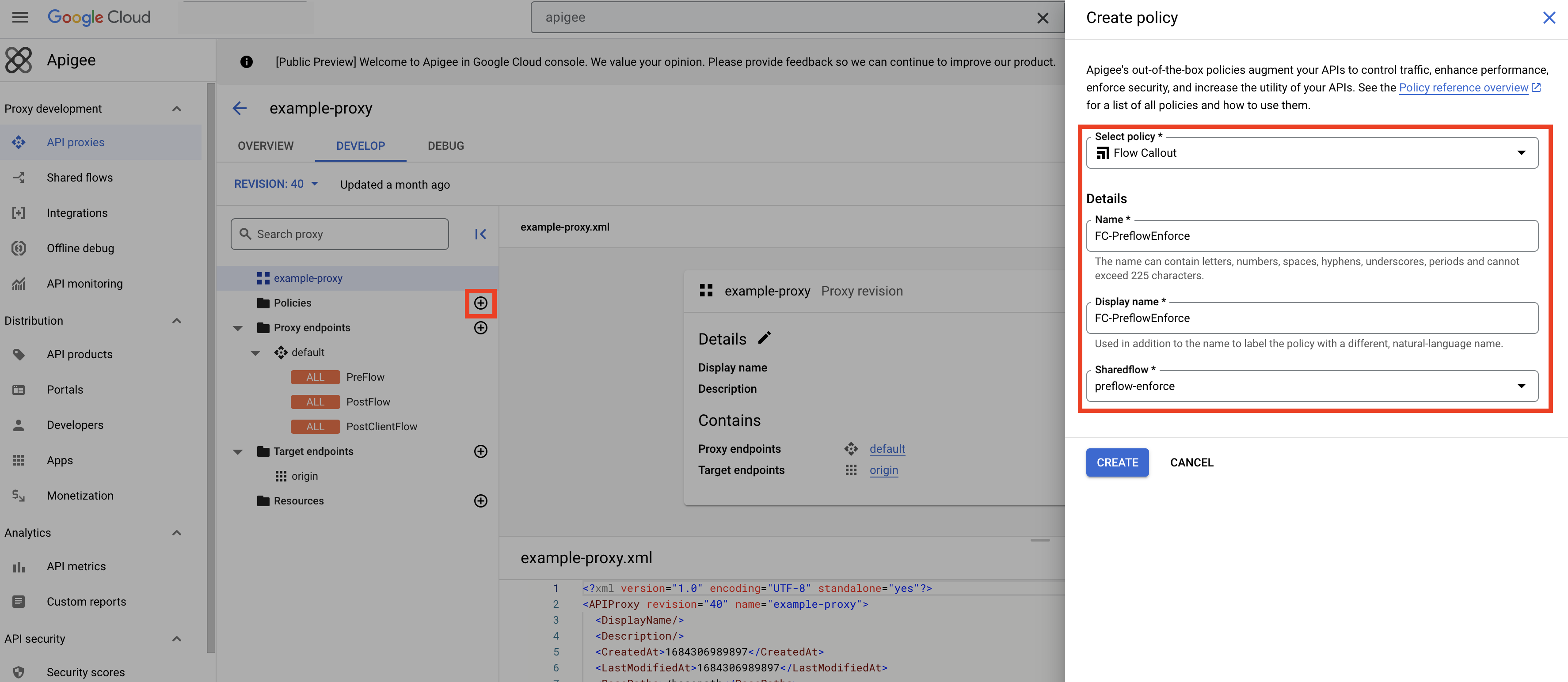 FC-PreflowEnforce, select thepreflow-enforceshared flow from the drop down, and click Create.