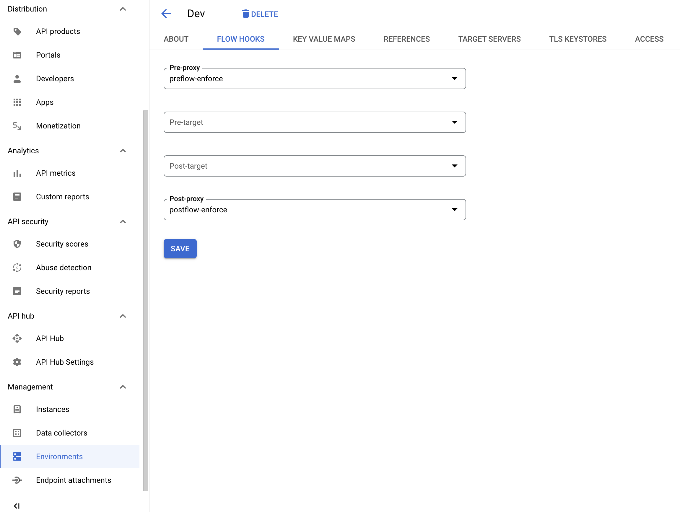 As with any Shared Flow Bundle, it is possible to trigger the preflow-enforce and postflow-enforce bundles as flow hooks in your desired environment. Rather than create and invoke the FC-PreflowEnforce and FC-PostflowEnforce policies as described above, you can simply select the two Shared Flow Bundles as Pre-proxy and Post-proxy hooks, respectively.