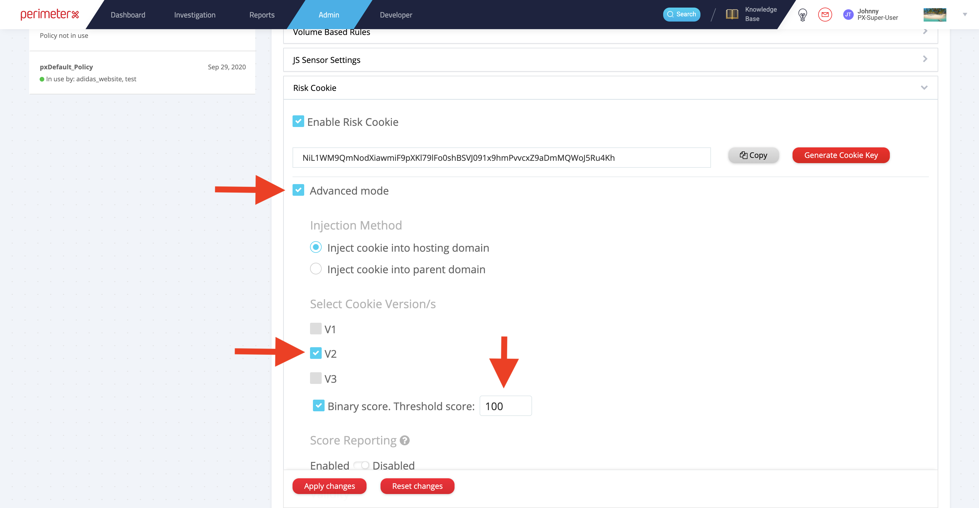 - Select the Cookie Version (V2), set the Binary Score/Threshold Score (100), and the Validity as appropriate.